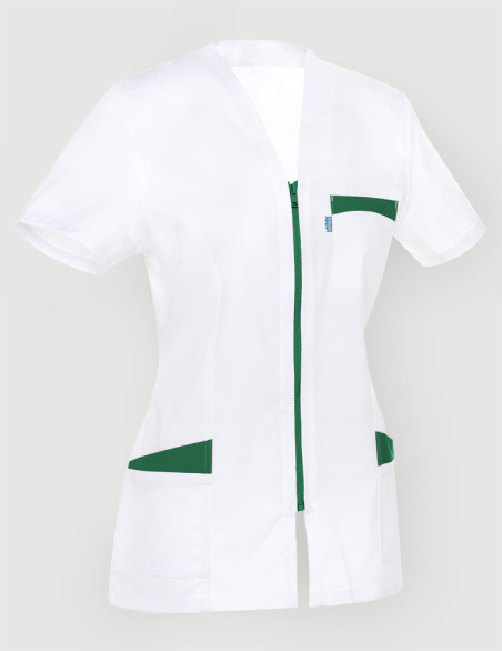 Avec sa longueur raccourcie, son encolure en V, son zip de fermeture, la blouse médicale Louise allie modularité, rigueur de la coupe et raffinement des détails. Particulièrement adaptée au secteur dentaire ou en pharmacie, ses trois poches avant sont soulignées d'une fine bande de tissu dans des tons vifs.