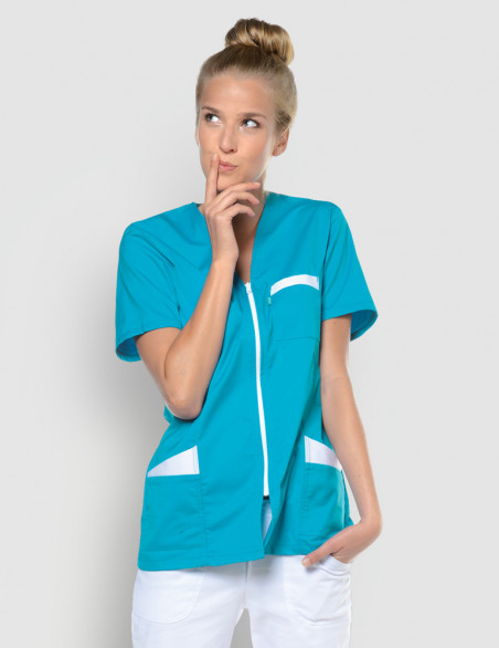 Coupe universelle - Convient à toutes silhouettes du S au XXXL. Tunique médicale cintrée, fermeture zippée, 3 poches, fentes dos. Longueur dos 74 cm. Manches courtes ou longues