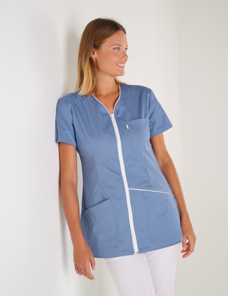 Tunique médicale cintrée, 3 poches, fermeture zippée, ouvertures sur les hanches, liseré asymétrique - Longueur dos 74 cm. Manches courtes uniquement.