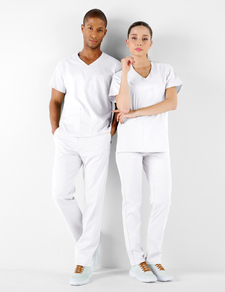 Rio reprend la ligne de la blouse Jules en la déclinant en textile Beliocel dans les coloris blanc, noir, olive, sauge, et beige. Particulièrement adaptée aux dentistes, assistantes dentaires, vétérinaires et kinésithérapeutes, ce modèle unisexe unifiera vos équipes avec élégance et confort. À accorder aux pantalons de la collection Beliocel India pour les femmes et Malo pour les hommes