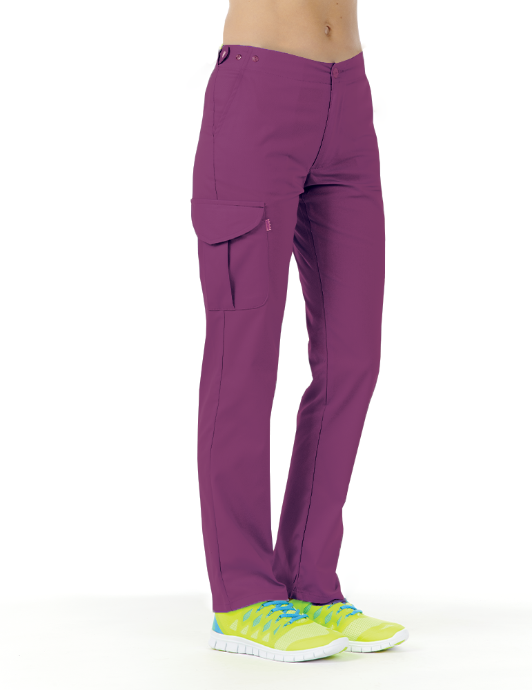 Pantalon médical femme Axel by Belissa, couleur cassis vue de face, poche treillis sur jambe droite porté avec sneakers