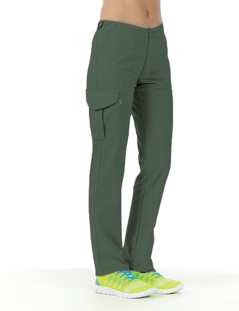 Pantalon médical femme Axel by Belissa, couleur kaki vue de face, poche treillis sur jambe droite porté avec sneakers